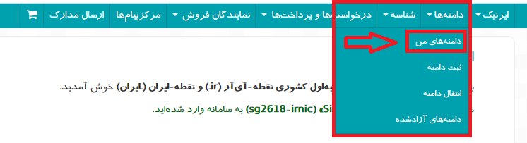 سپس مطابق تصویر زیر از منو دامنه ها  زیر منوی دامنه های من را کلیک نمایید .