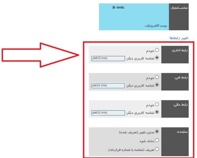 در قسمت بعد همانند تصویر زیر در قسمت مشخص شده روابط کاربری خود را بر روی pb615-irnic  تنظیم نمایید و “اعمال” را کلیک نمایید .