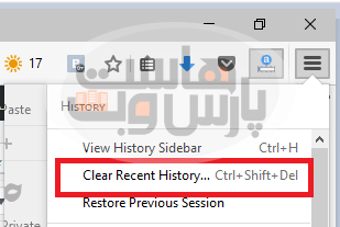 مجدد در صحفه باز شده بر روی Clear Recent History کلیک نمائید.(همچنین با فشردن ctrl+shift+delete میتوانید به صورت میانبر به این پنجره دسترسی پیدا کنید)