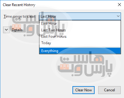 حال پنجره ای دیگر برای شما به نمایش در آمده هست,در قسمت Time range to clear شما میتوانید مقدار بازه زمان که کش ذخیره شده را انتخاب کنید,برای پاک کردن تمام کش گزینه Everything انتخاب نمائید.